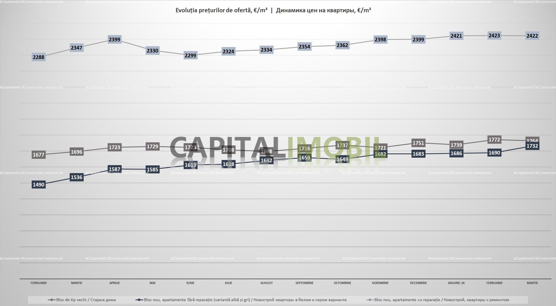 Обзор рынка проводился в период 28-31 марта 2026 года. В ходе этого исследования, были собраны данные о 4 680 квартирах, предлагаемых к продаже в мун. Кишинёв, затем информация была обработана и проанализирована для определения средних цен предложения €/m2 по каждому типу квартир.