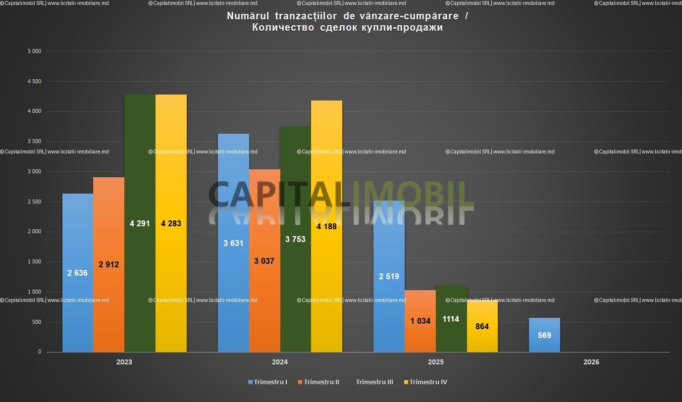 Согласно данным ÎP "Cadastru", в триместре I 2026 года в Кишинёве было зарегистрировано 569 сделок купли-продажи квартир, что на 34% ниже, чем в предыдущем триместре, и на 77% ниже, чем за тот же период 2025 года.